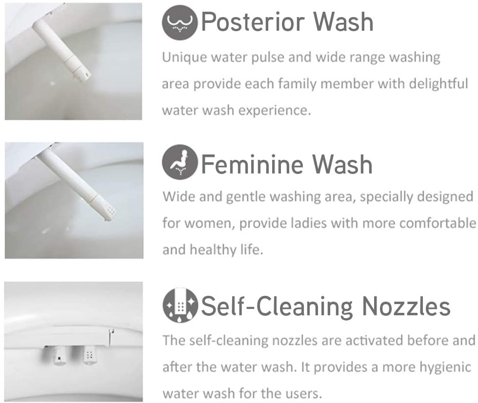 - DUAL RETRACTING NOZZLES WITH AUTO UV CLEAN- Bidets with only one nozzle can often be unsanitary and ineffective for females. The EuroLux features separate rear wash and feminine wash retracting nozzles for MAXIMUM SAFETY and OPTIMAL HYGIENE. The nozzles are manufactured with proprietary polycarbonate material to maintain cleanliness while a built-in, PATENTED, ULTRAVIOLET LIGHT system ensures 100% cleaning every time.