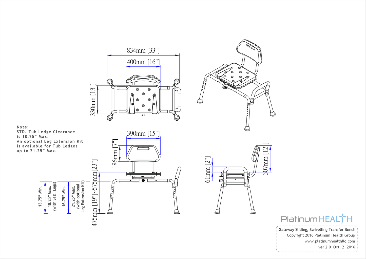 * Horizontal extension kits are available to increase the overall width of the frame as well as the seat travel by either 4 inches or 8 inches.